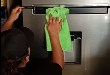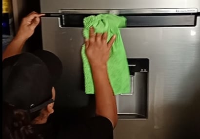 Extraemos los alimentos de la refrigeradora, para limpiar la superficie interior, también limpiamos toda la superficie exterior.