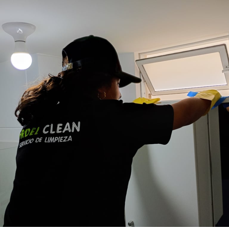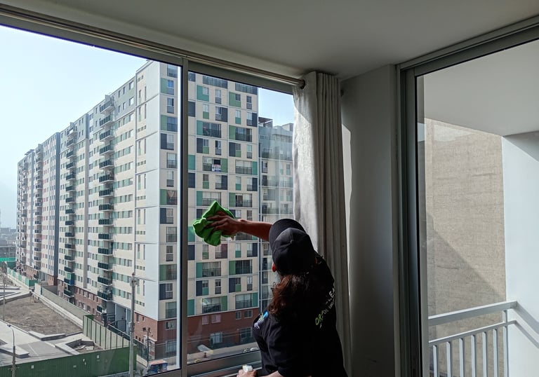 Para limpiar ventanas y mamparas, primero sacamos todo el polvo, luego rociamos el líquido limpiavidrios sobre la superficie, esperamos unos minutos, limpiamos con un paño de microfibra o esponja en movimientos circulares, finalmente secamos con un paño limpio en movimiento circular para un acabado brillante.