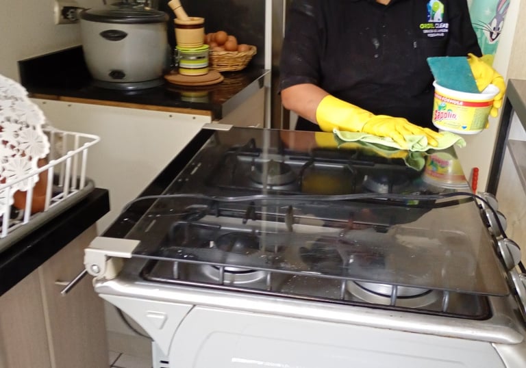 Removemos la grasa y desperdicio de alimentos, en la superficie y hornillas, y en la parte interior, también removemos la grasa en la superficie de la campana extractora de aire.