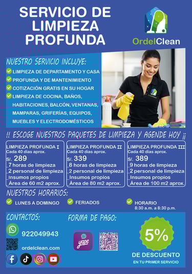 Realizamos una limpieza profunda, que es básicamente una limpieza exhaustiva y completa en todas las superficies y rincones de un hogar, incluyendo áreas de difícil acceso como detrás de los muebles, dentro y superficie de los electrodomésticos y en armarios.